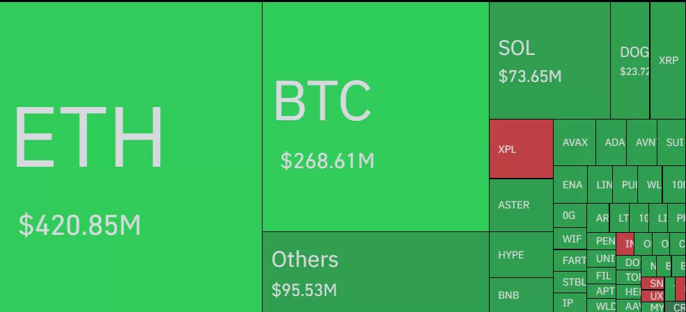 Market-wide liquidations exceeded $1.1 billion in the last 24 hours. Long positions accounted for $1.03 billion, while short positions accounted for $72.3 million. The largest liquidations were seen in ETH ($420.85 million), while Bitcoin saw $268.61 million and Solana saw $73.65 million in liquidations.