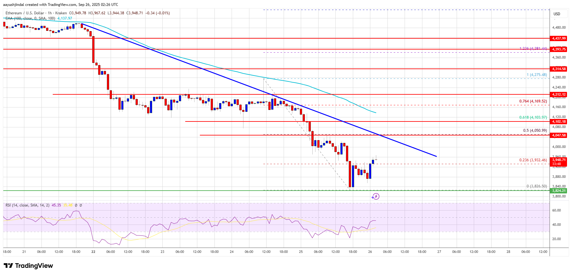 The bears even pushed the price below $4,000. A low was formed at $3,826 and the price recently started a minor recovery wave. There was a move above the 23.6% Fib retracement level of the downward wave from the $4,275 swing high to the $3,826 low.