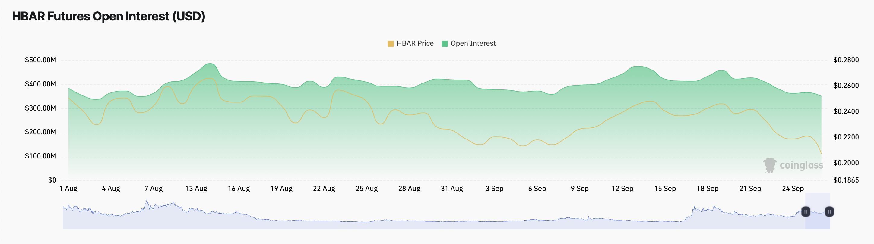 HBAR currently trades at $0.2077, down 15% in the past seven days. This double-digit price dip has dampened sentiment across the token’s derivatives market, reflected by its plummeting futures open interest. According to Coinglass data, this sits at $350 million as of this writing, falling 26% since September 13.
