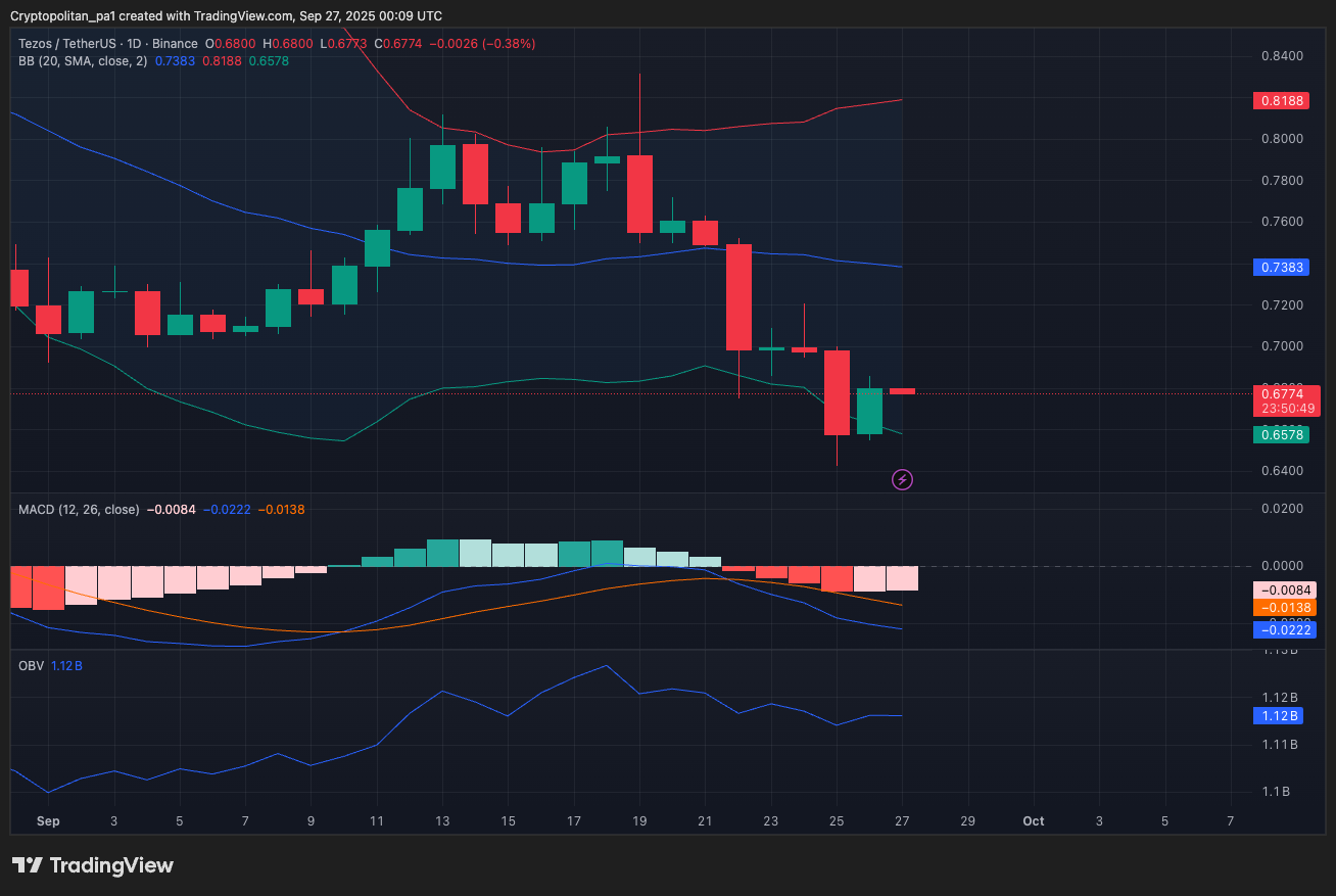 On the daily chart for September 27, Tezos is consolidating just above $0.67 after a sharp selloff. The Bollinger Bands are widening, with price leaning toward the lower band at $0.6578, signaling persistent downside risk. The MACD remains negative, with the histogram still favoring bears, and OBV shows no meaningful uptick in buying volume.